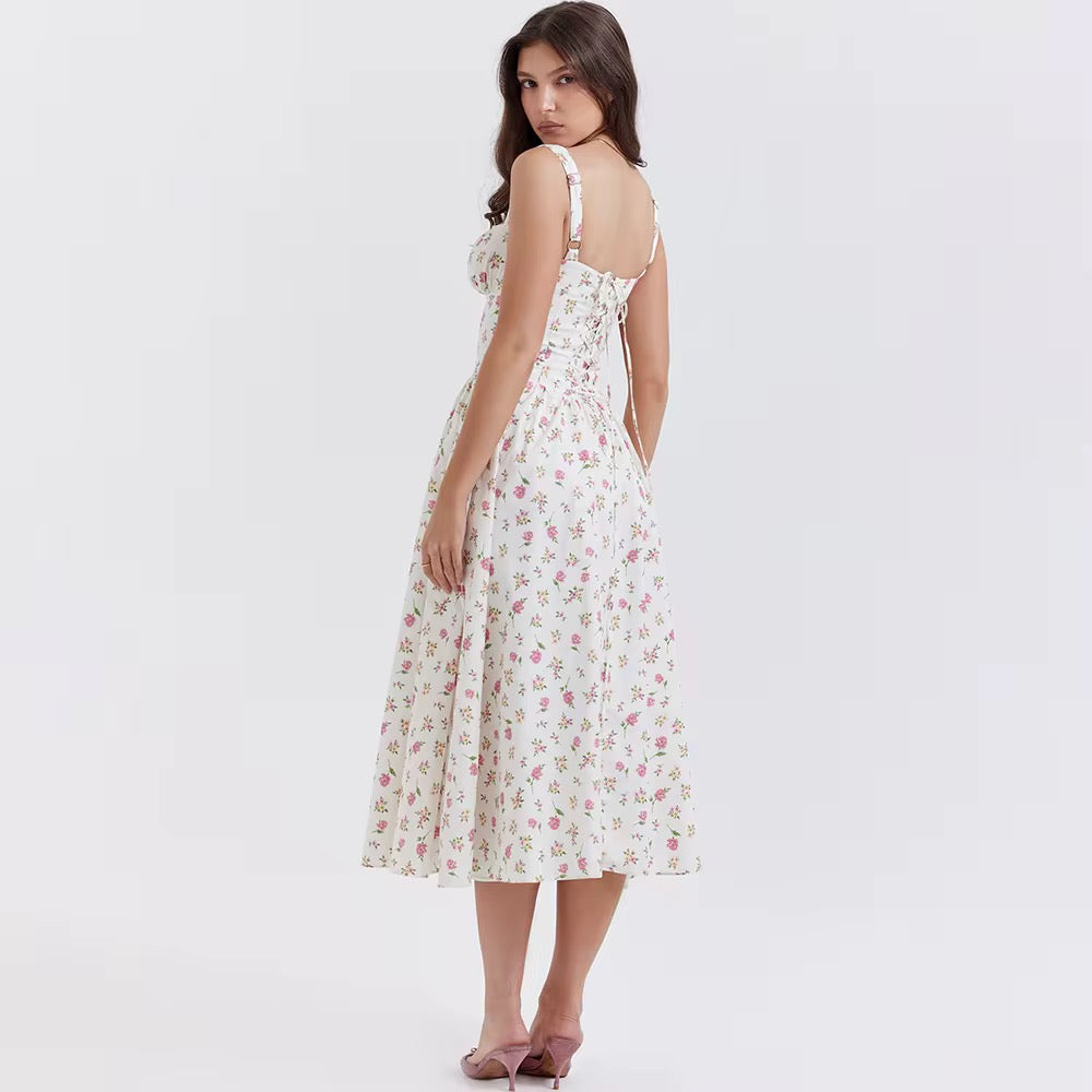 Éloïse – White Corset Floral Midi Dress